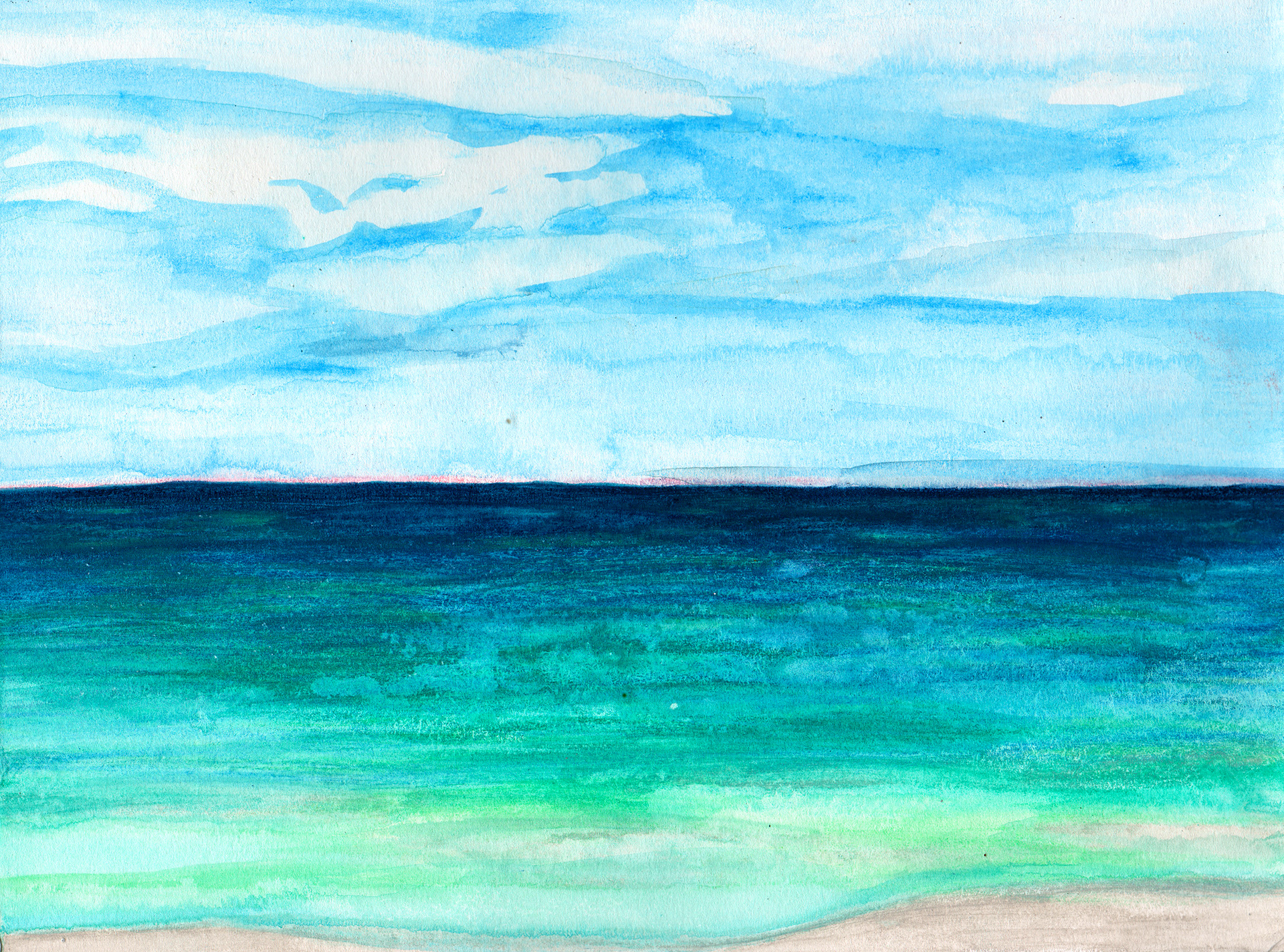 Curator Note: Painted after a friends wedding in Tulum, while tanning and drinking cervezas at Hotel Casa Malca. I used the water from Tulum's shoreline out the empty Corona bottle.